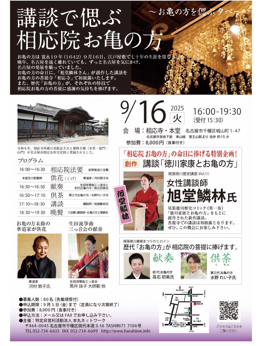 - 9月16日(火)16:00~19:30(受付15:30) 会場:相応寺 本堂 ~お亀の方を偲ぶ夕べ~