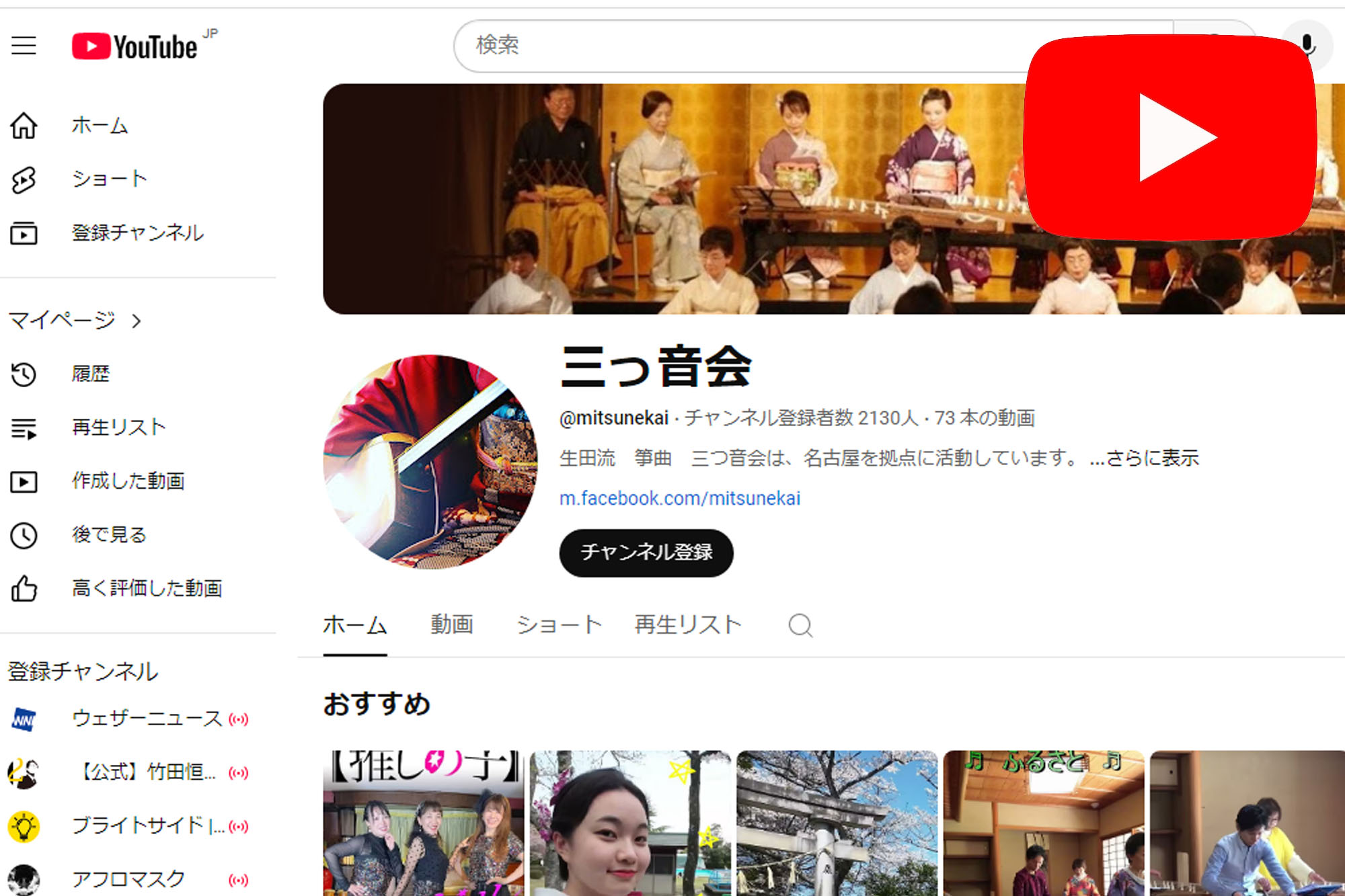 また、時代にそったアニメ曲など身近に箏を楽しんでもらえる楽曲でYouTube やFacebookにて日々の活動をご覧いただけます。是非、この機会に我々三っ音会を知っていただけましたら、幸いでございます。